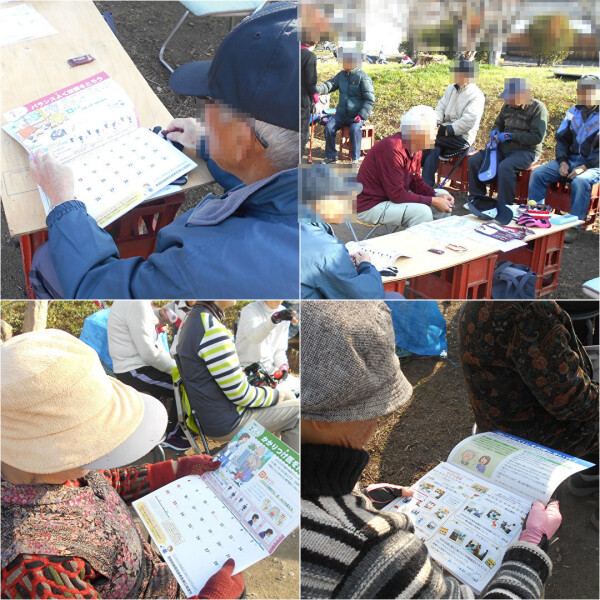今回は、積善会の老人会と安倍史跡公園グラウンドゴルフの活動をされている皆さんと合同でのグラウンドゴルフの活動です。楽しそうにプレーされ、いつもより多い人数で互いのプレーを褒め合っている姿が印象的でした。休憩時間にはお茶を飲みながら談笑され、和やかな雰囲気でした。地域包括支援センターのぞみから、『のぞみ通信12月号』と奈良県後期高齢者医療連合発行の『健康長寿カレンダー』をお渡ししました。