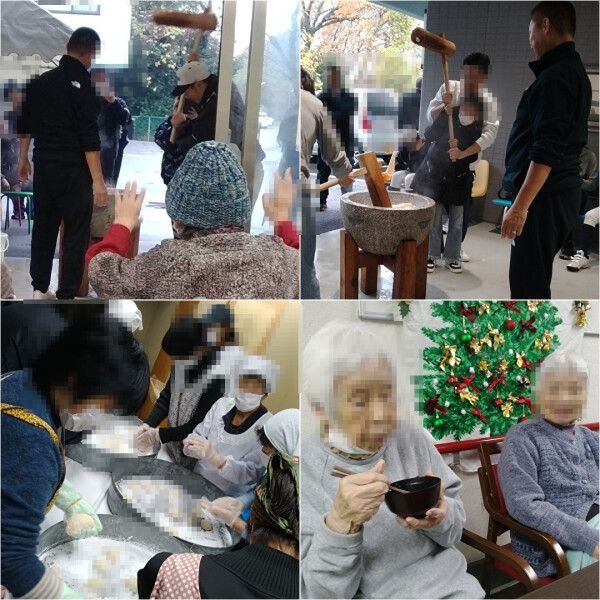 ボランティア団体様、県立商業高校野球部の皆様、地域の皆様等々大勢のボランティアさまのお力添えを戴きまして、餅つき大会を開催することができました。蒸しあがった熱々のもち米を石臼に、力強い杵の音が響きます。『お正月』の歌を唄って餅つきの応援を手拍子とともにおくります。搗きあがったお餅で小豆たっぷりの美味しいお善哉をよばれました。