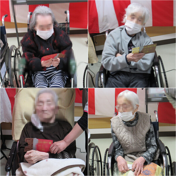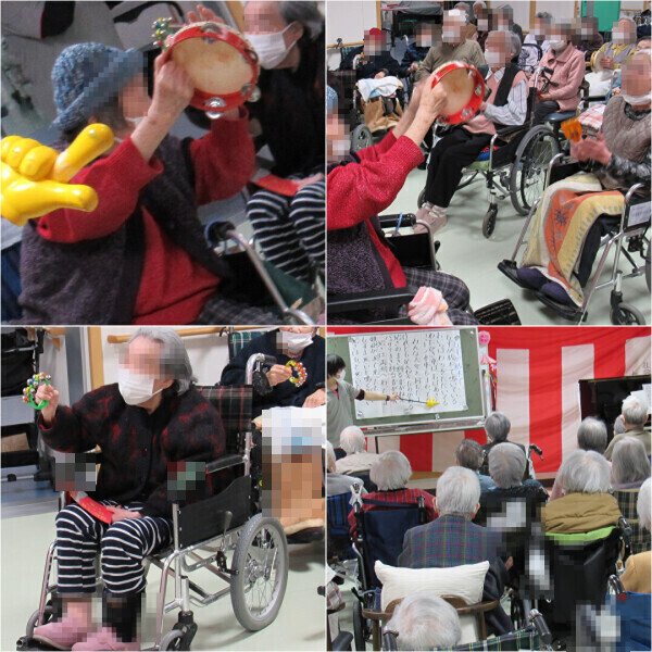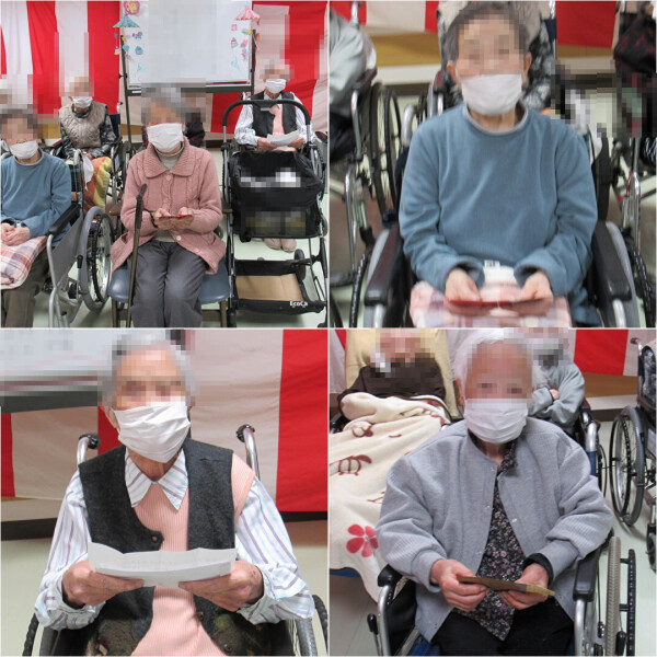スタッフ手作りのお誕生日カードを受け取り、にこにこ笑みを浮かべる方、他の方のカードが気になる方、すやすや睡眠優先の方、それぞれです。お誕生日会の催しはピアノ伴奏にあわせて皆さんでの合唱です。音楽は音色だけでなく、流行った当時を思い出させてくれるようで涙こぼされながら歌われる方もみえました。