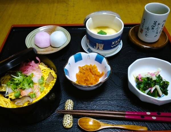 彩り鮮やかなちらし寿司、ほうれん草のお浸し、茶わん蒸し、人参のラぺ、紅白饅頭です。